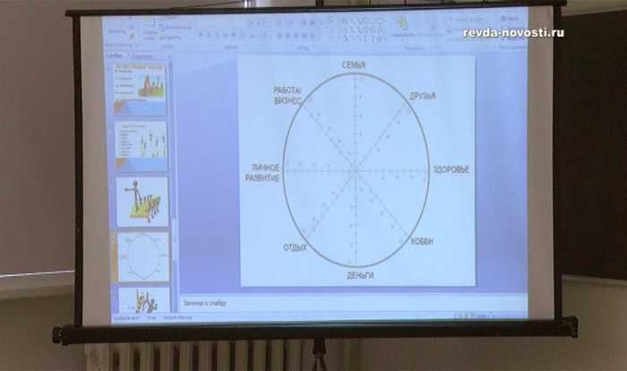 Андрей Дубровский и Илья Хасанов защищали проект «Коучинг, как путь к саморазвитию». Ребята представили жизнь человека в виде круга с секторами, которые означают семью, друзей, хобби, работу, отдых, здоровье и деньги. По мнению студентов, поля должны быть заполнены равномерно и как можно полнее.