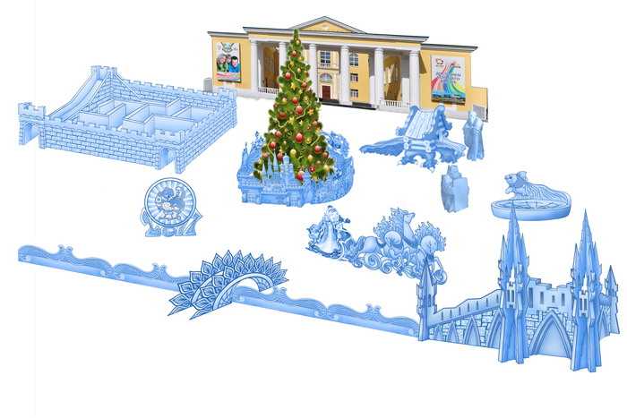 Итак, входная группа предусматривает как минимум два входа — резной мост и ворота в стенах ледового замка. В центре площади установят высокую искусственную ель, окруженную ледяной сказочной архитектурой. Большая горка будет отличаться от прошлогодних. Во-первых, это будет настоящий замок. Во-вторых, чтобы попасть на горку, ребятишкам нужно будет преодолеть ледовый лабиринт. Такая комбинация сразу двух элементов городка выгодно совмещает любимые развлечения маленьких ревдинцев. Предусмотрена и маленькая горка — она будет выполнена в форме теремка. Также детишек в новогоднем городке ждет ледяная ванна с золотой рыбкой, скульптуры Деда Мороза и Снегурочки, и, конечно же, символа Нового 2017 года — Петушка.