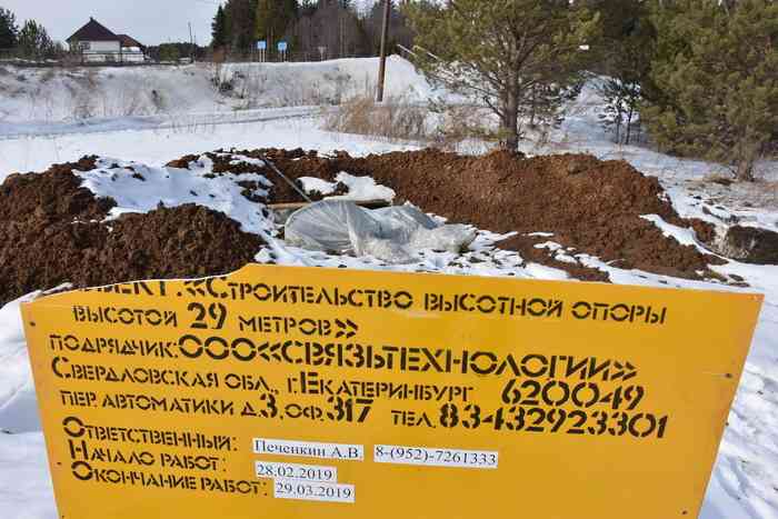 Рабочих, что-то раскапывающих на пятачке в начале улицы Софьи Ковалевской, местные жители приметили 10 марта. Через пару дней сюда подъехала бетономешалка, строители что-то заливали, а после ретировались и установили табличку: «Строительство высотной опоры высотой 29 метров».