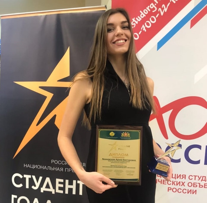 Арина Якимовская — студентка 4-го курса Уральского государственного экономического университета. Она уже известна в нашем городе, как певица, выпускает собственные треки и пишет музыку. Недавно копилка ее достижений пополнилась — Арина стала «Студентом года» в Свердловской области и достойно выступила на федеральном этапе. Церемония награждения отличившихся студентов из нашей области прошла 24 января в УрГЭУ. Мы поговорили с Ариной о том, как ей все это удалось.
