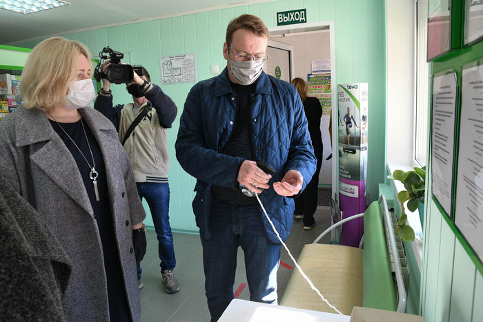 Министр Алексей Кузнецов начал визит с аптеки «Долголетие» на Мира, 21, где первым делом обработал руки санитайзером: